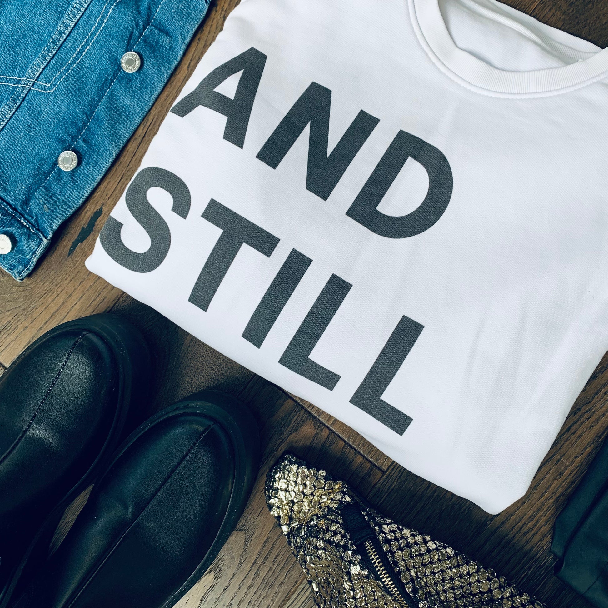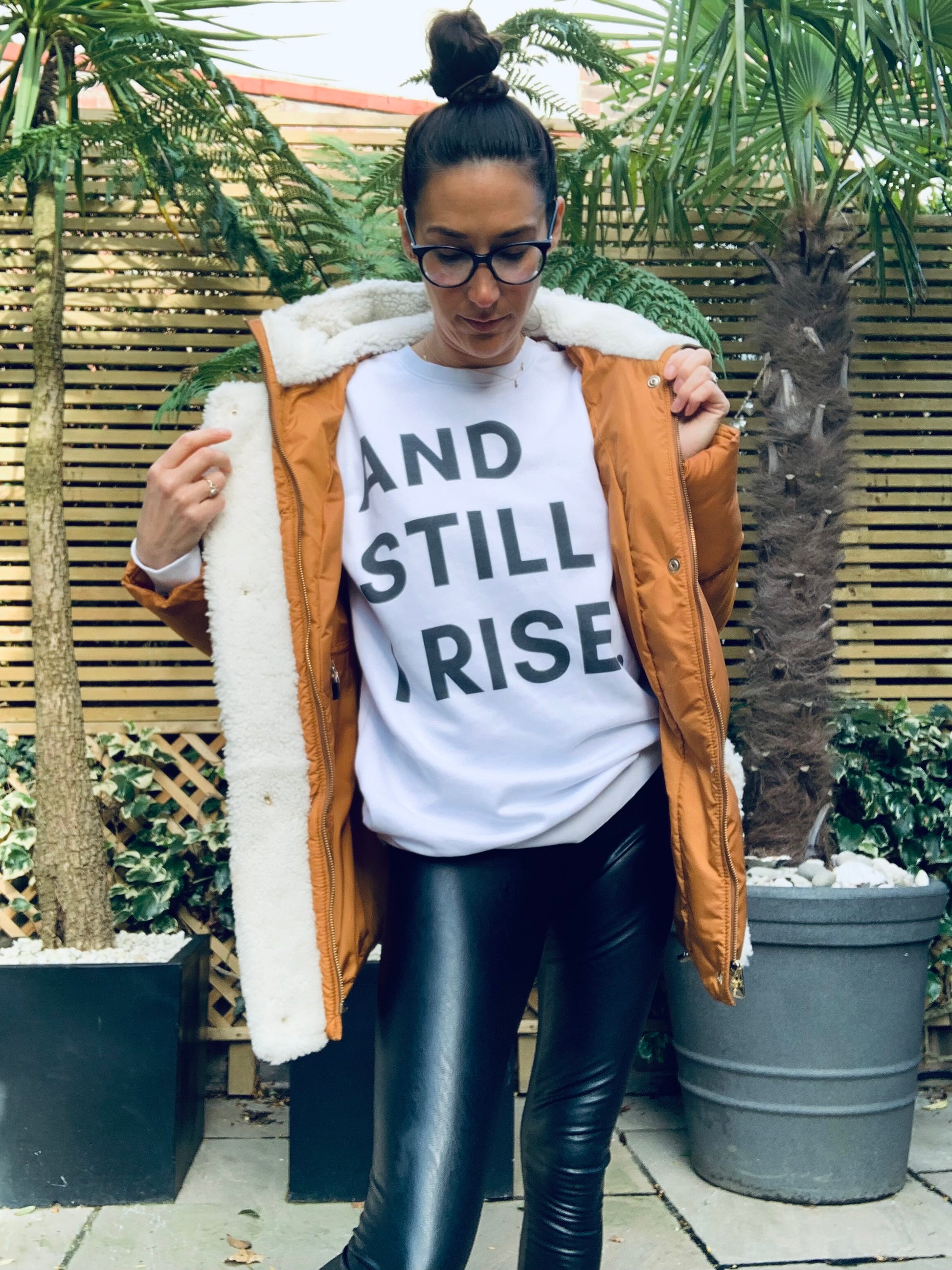 Organic cotton and recycled polyester sweatshirt. Supersoft and fleecey lined. Screen printed in bold text with the words AND STILL I RISE, with a beautiful hand drawn sun to the reverse. Wear it and know that whatever adversity you face, hope will always prevail.