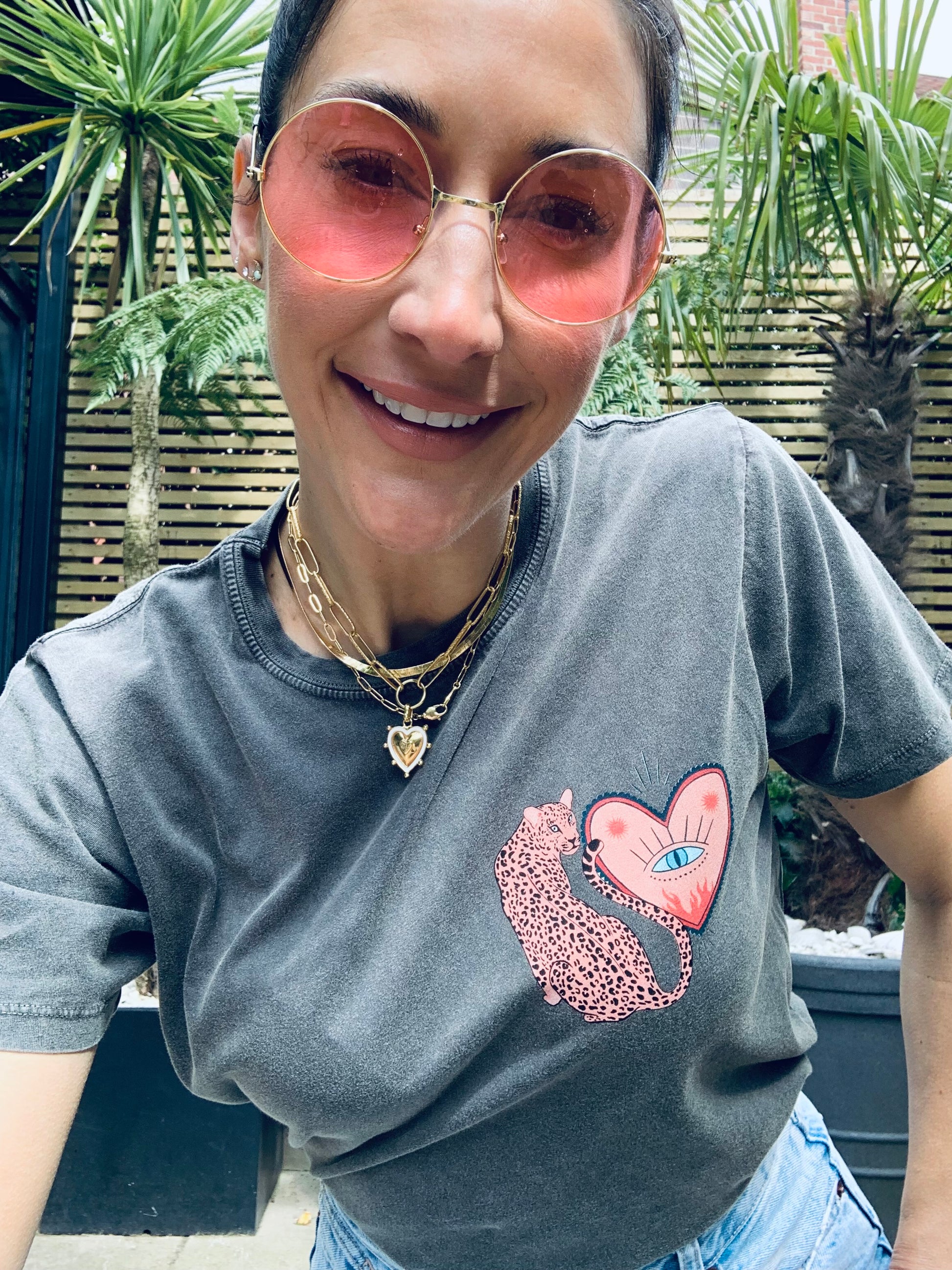 Buttery soft, stonewash-grey, oversized organic cotton teeshirt. Embellised across the left chest with the stunning hand drawn image of a leopard and TL+TS signature evil eye heart.
